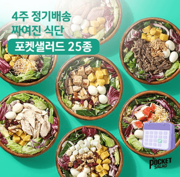 다이어트와 식단 관리의 가장 큰 적은 ‘귀찮음’과 ‘질림’입니다. 포켓샐러드 4주 정기배송은 전문가가 짜놓은 식단에 맞춰 매일 다른 종류의 샐러드를 집 앞까지 배송해 줍니다.