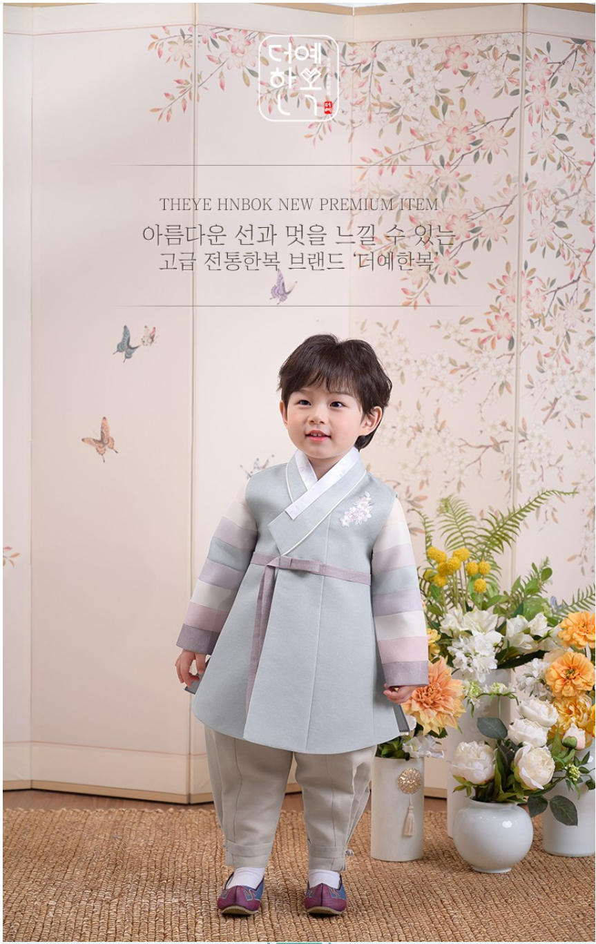 - 특징: 흔하지 않은 은청색(하늘빛) 저고리와 순백의 치마가 만나 깨끗하고 청순한 무드를 연출합니다. 저고리의 꽃자수가 포인트가 되어 아이의 얼굴을 더욱 환하게 밝혀줍니다.