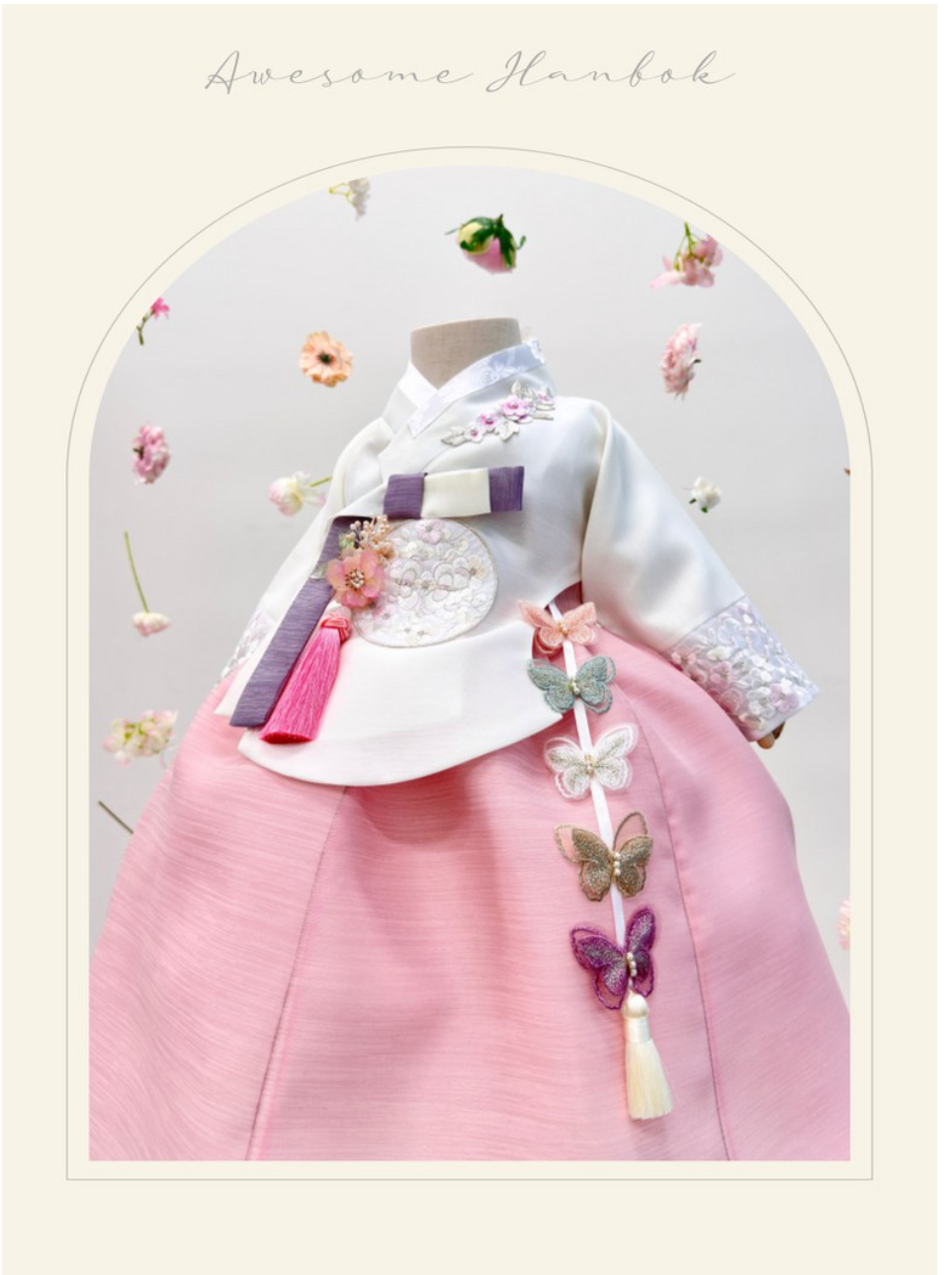 어썸한복 단미 꽃자수 | 아이보리+핑크 | 입체나비장식 및 측면 노리 | 당의 저고리 치마 | 여아용 | ; | |