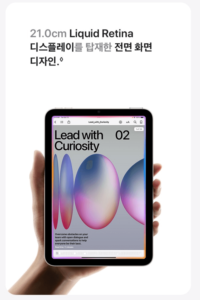 - 특징: 8.3형의 콤팩트한 사이즈로 언제 어디서나 독서, 게임, 메모가 가능합니다. 특히 이번 모델은 Apple Intelligence를 위해 설계되어 작지만 똑똑한 AI 기능을 모두 누릴 수 있습니다.