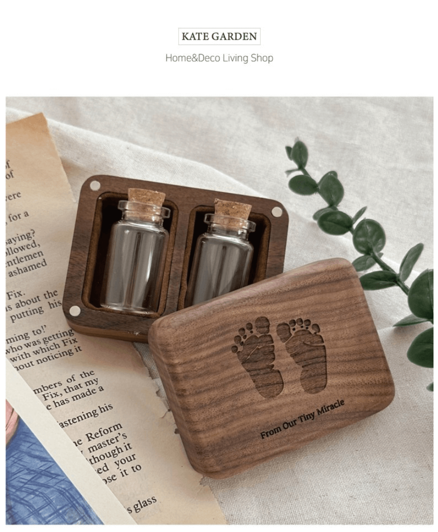 - 맞춤형 각인 서비스: 덮개 부분에 아기의 실제 발도장, 이름, 생년월일, 몸무게 등을 레이저로 각인하여 세상에 하나뿐인 기념품을 만듭니다.